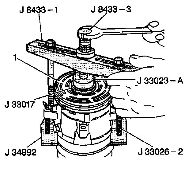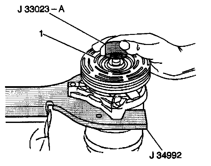 16. Tighten the center screw in the J 8433-1 in order to force the pulley rotor and bearing assembly (1) onto the compressor front head.
