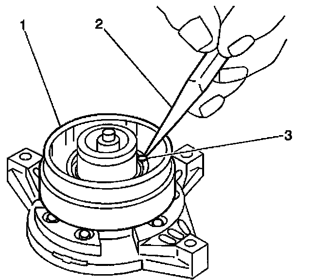 9. When the coil is fully seated on the front head, use a 1/8 inch diameter drift punch (2) in order to stake the front head at 3 places 120 degrees apart (3), in order to ensure that the clutch coil (1) remains in position.
