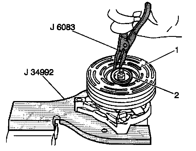 11. Tighten the J 8433-3 against the puller pilot in order to remove the clutch coil (2)
