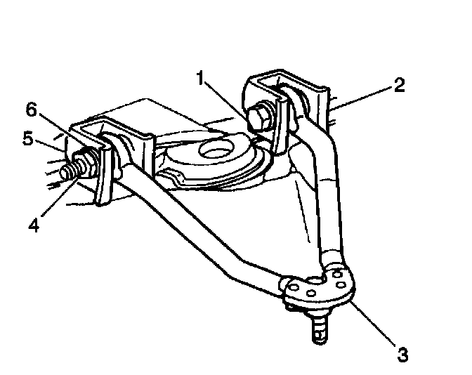 5. Lift the upper control arm (2) up and to the side in order to gain access to the inner portion of the frame bracket.