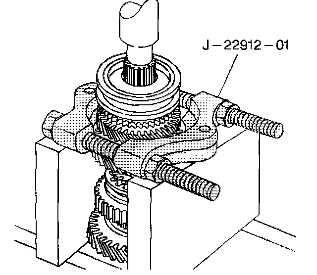 58. Using a hydraulic press and the J 22912-01 remove the 3rd speed gear and the synchronizer assembly. Use the J 22912-01 under the gear to prevent the synchronizer hub from separating from the synchronizer sleeve.
