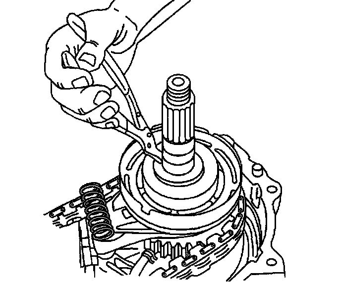 48. Install the rear output bearing snap ring to the mainshaft. The flat side of the snap ring must face the rear of the assembly.