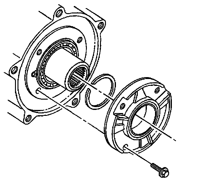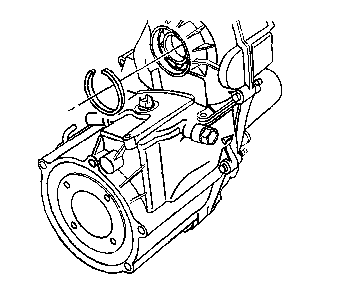 38. Remove the retaining ring securing the front output shaft front bearing.