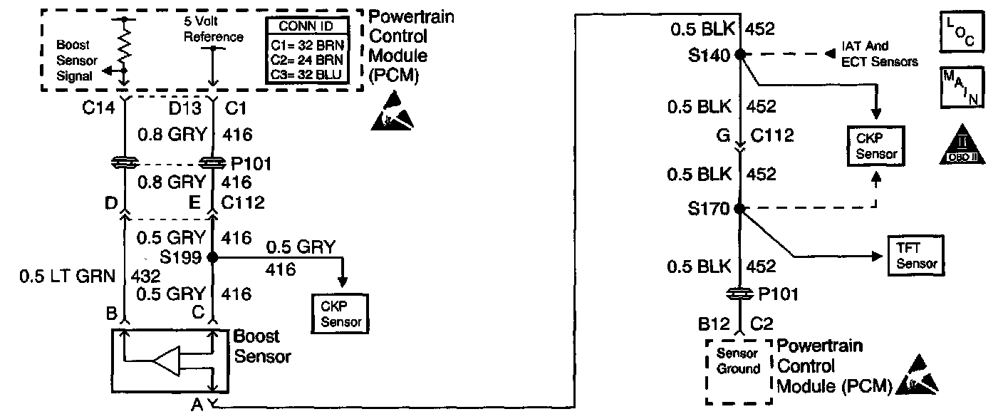 The PCM operates a solenoid to control boost. This solenoid is normally open. By providing a ground path the PCM energizes the solenoid which then allows vacuum to pass to the wastegate valve. During normal operation, the PCM compares its wastegate duty cycle signal with the boost signal and makes corrections in the duty cycle accordingly.