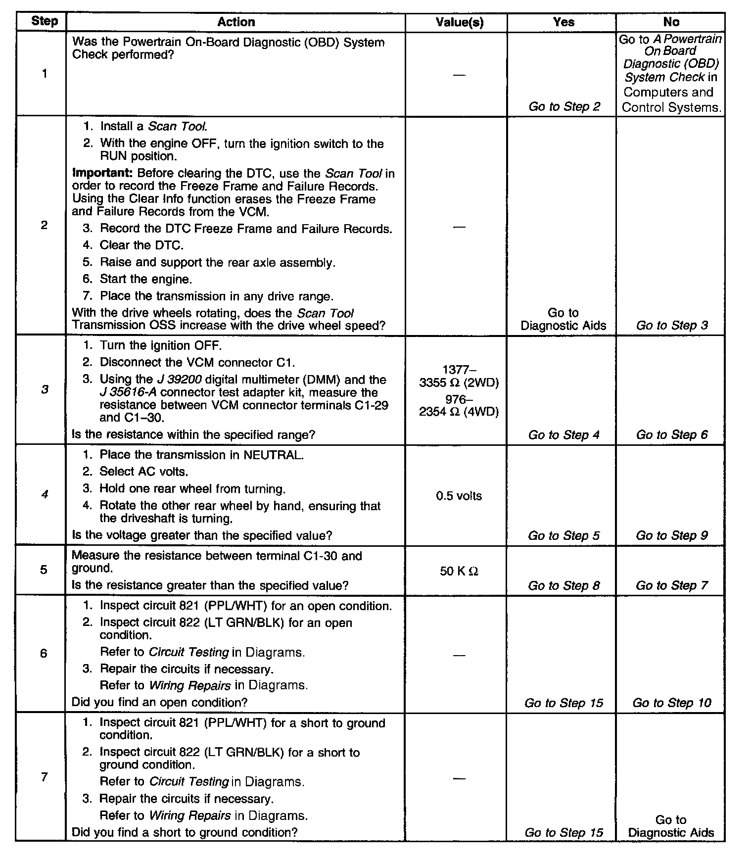 The numbers below refer to the step numbers on the diagnostic table.