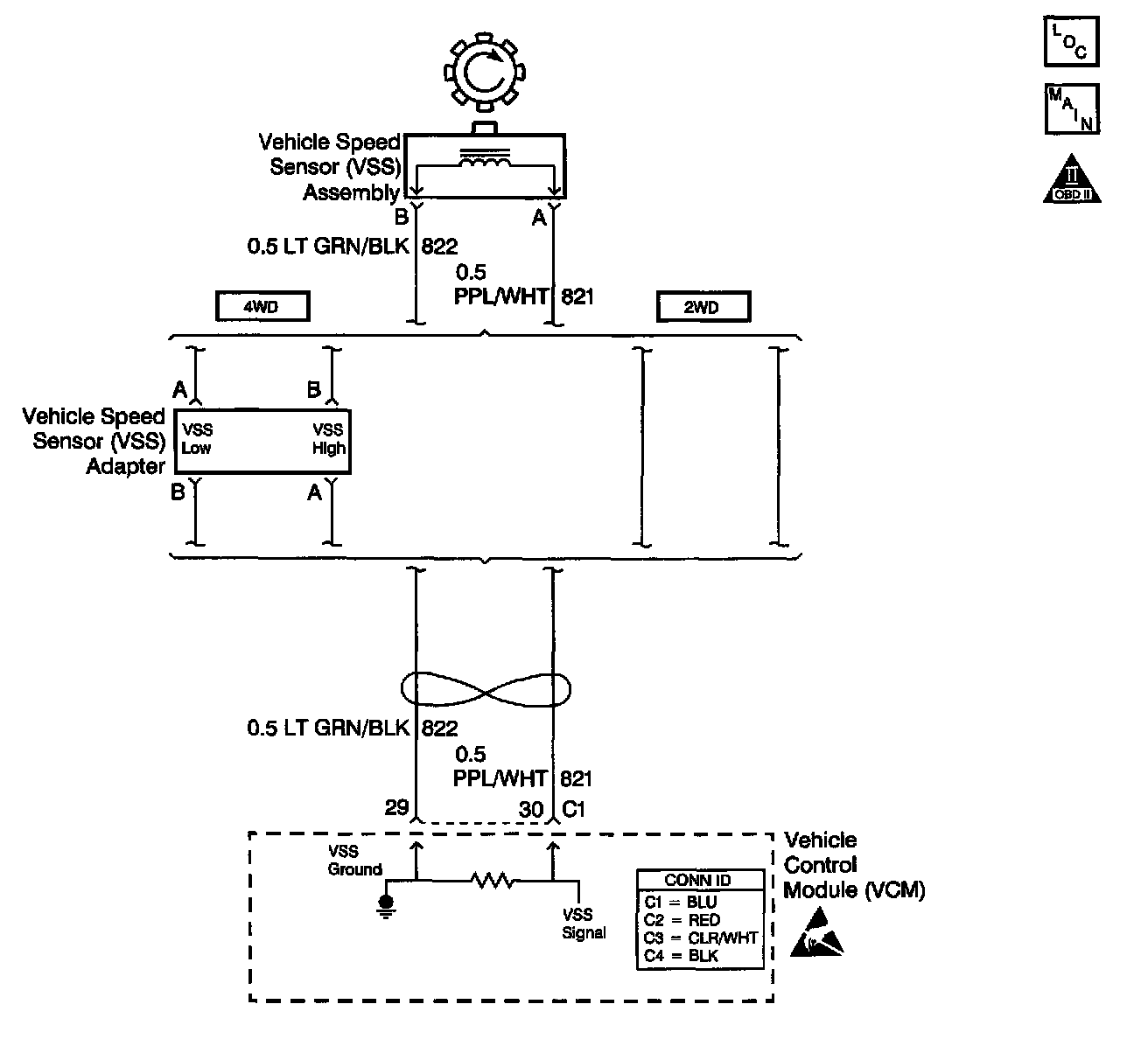 The Vehicle Speed Sensor (VSS) assembly provides vehicle speed information to the Vehicle Control Module (VCM). The VSS assembly is a Permanent Magnet (PM) generator. The PM generator produces a pulsing AC voltage as rotor teeth on the output shaft of the transmission (2WD) or transfer case (4WD) pass through the sensor's magnetic field. The AC voltage level and the number of pulses increase as the speed of the vehicle increases. The VCM converts the pulsing voltage to vehicle speed. The VCM uses the vehicle speed signal to determine shift timing and Torque Converter Clutch (TCC) scheduling.