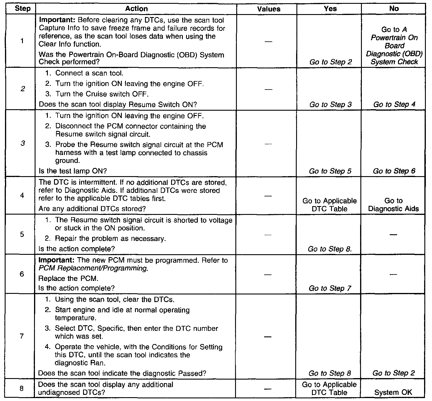 The cruise resume/accel switch is an input to the fuel control portion of the PCM. These inputs allow the PCM to control and hold a requested speed. The cruise resume/accel switch sends ignition voltage to the PCM when the switch is closed (ON).