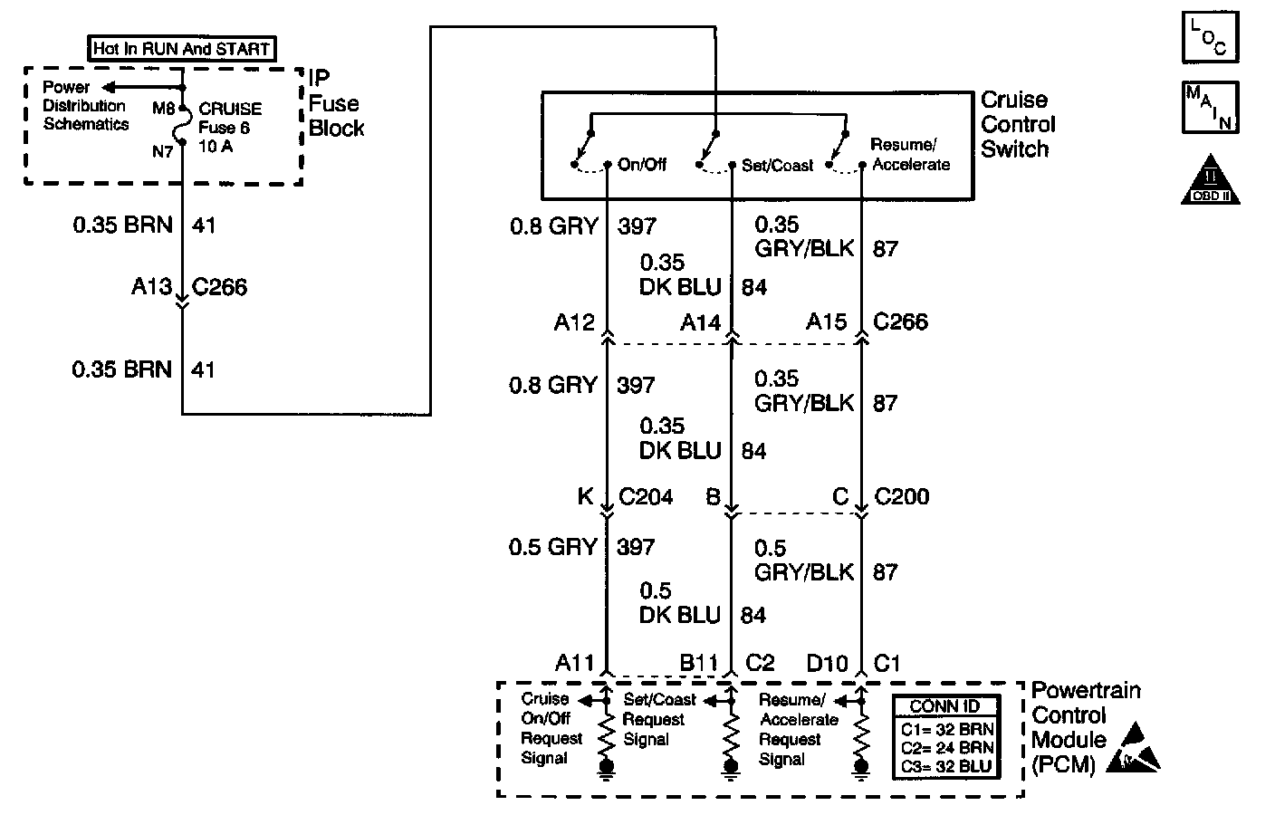 The cruise set/coast switch is an input to the fuel control portion of the PCM. These inputs allow the PCM to control and hold a requested speed. The cruise set/coast switch sends an ignition voltage signal to the PCM when the set/coast switch is ON.