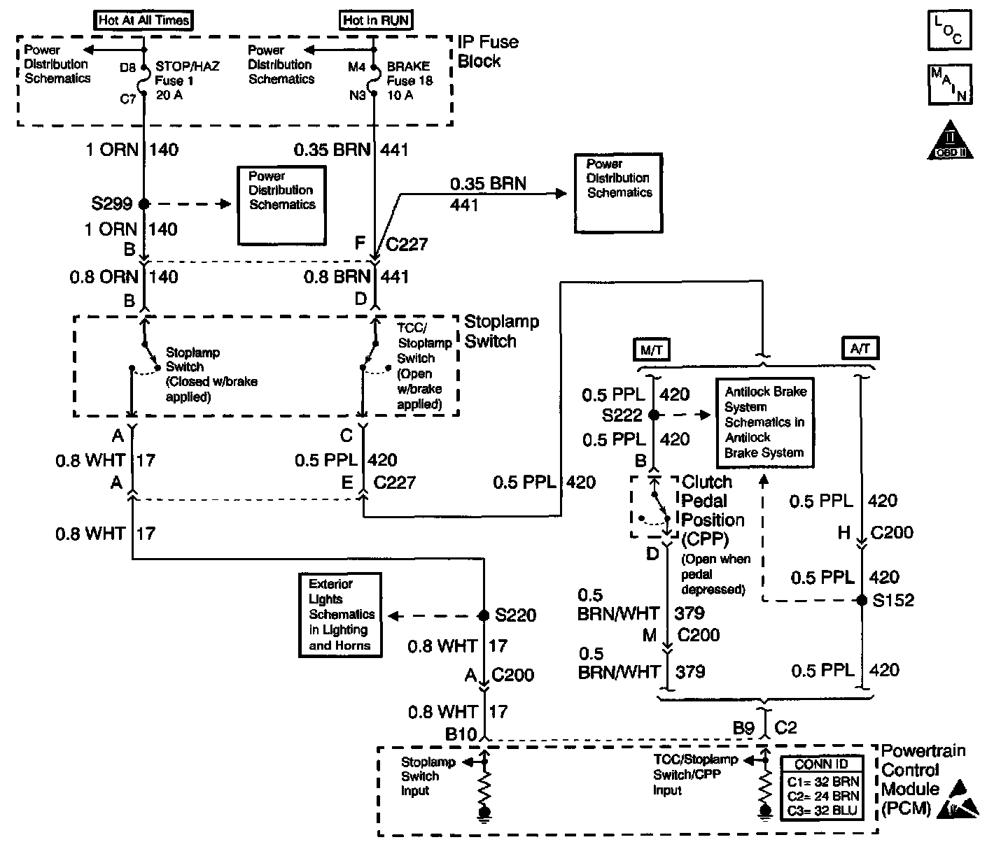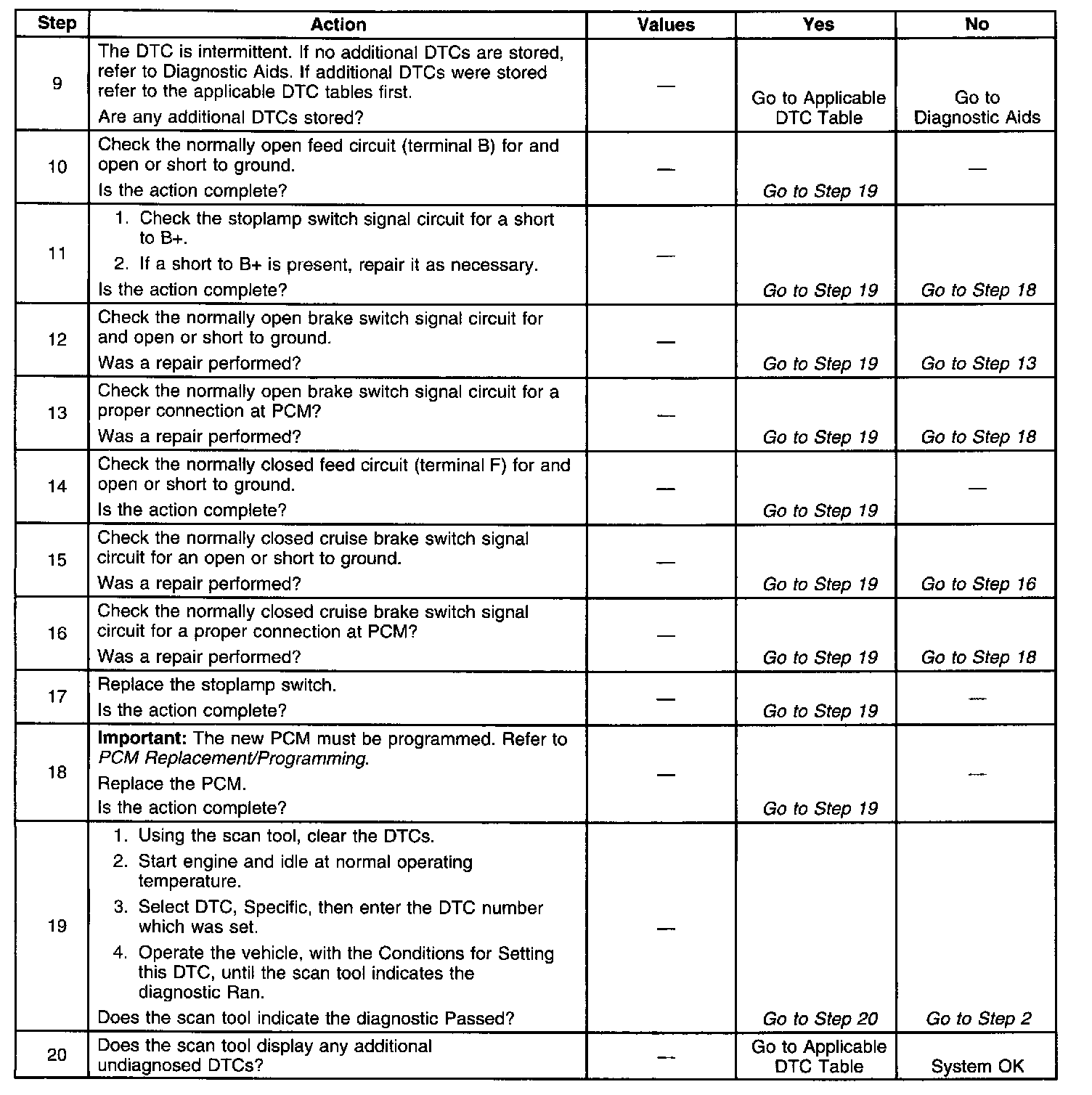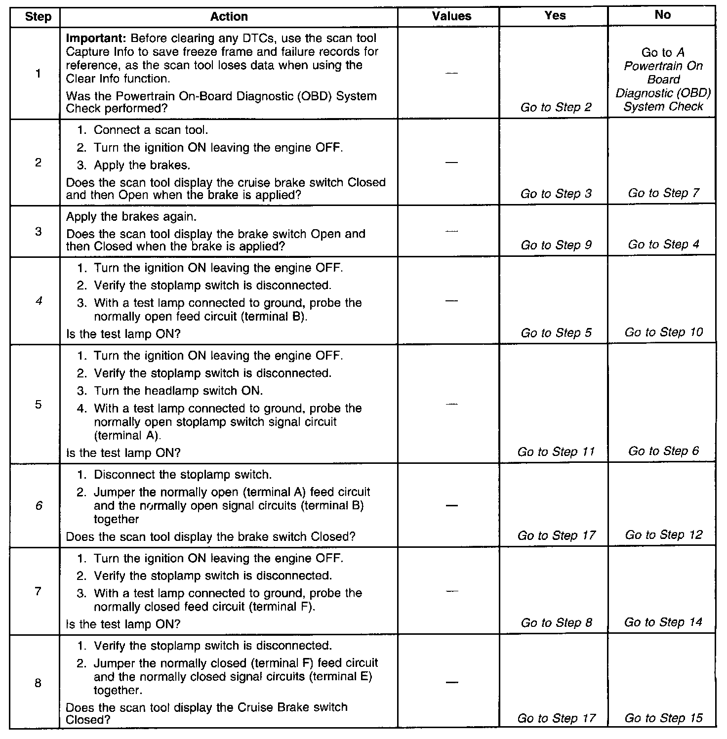The TCC normally closed cruise brake switch supplies a B+ signal on the Brake Switch Input circuit to the PCM. The circuit is opened when the brakes are applied. The stop lamp/cruise control normally open brake switch supplies a B+ signal on the Stoplamp Switch Input circuit to the PCM when the brake is applied.