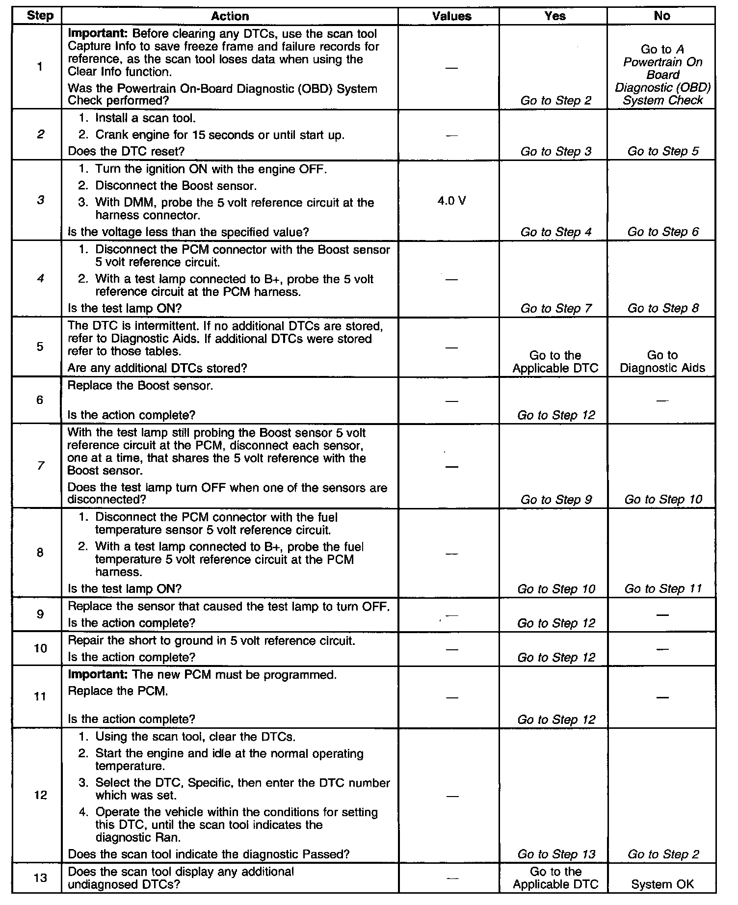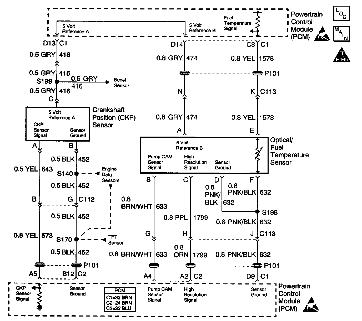 The PCM provides a 5 volt supply for use in powering up sensors. This test monitors the voltage present at terminals BRD13 (shared by Boost and crankshaft position sensors) and BRD1 4 (optical/fuel temperature sensor (cam/hires).