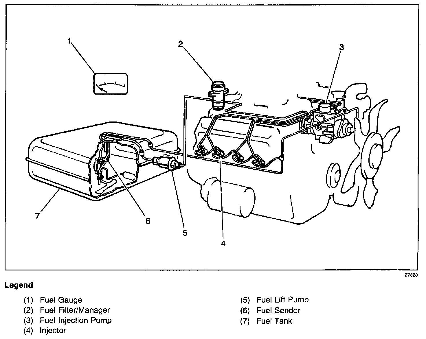 The fuel supply is stored in the fuel tank. Fuel is drawn from the fuel tank by the fuel lift pump. Fuel is then pumped through the fuel manager/filter. The fuel manager/filter is located on the intake manifold. The fuel is then transferred to the injection pump. Unused fuel is returned to the fuel tank by a separate line.