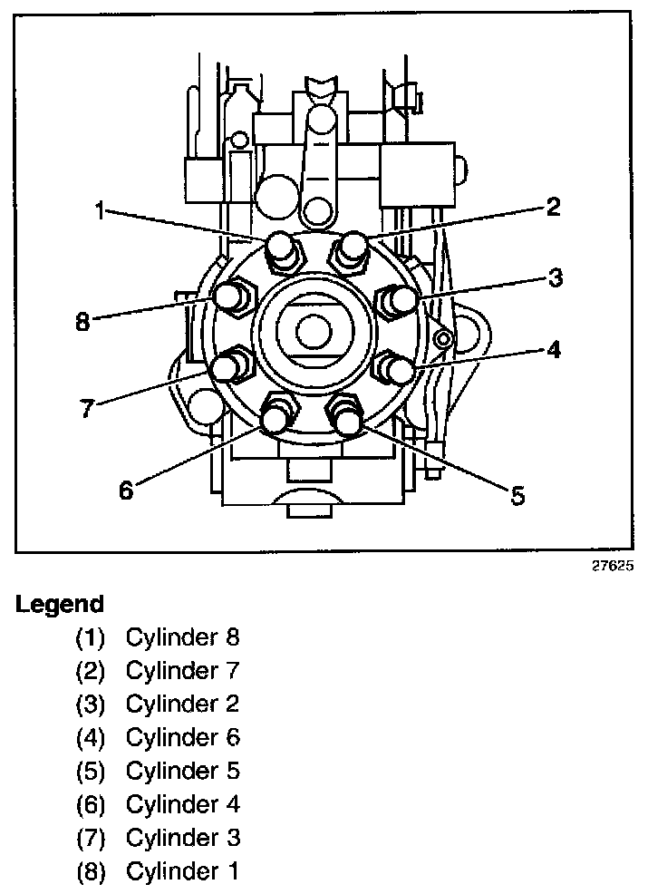 The injection lines connect the high pressure discharge fittings on the head of the injection pump to the injection nozzles. The injection lines are pre-bent for correct routing and connect to the injection pump head as shown in the figure above. The injection lines are equal in length and interior volume.