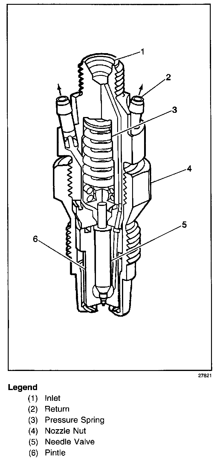 Each cylinder has an identical fuel injection nozzle mounted in the pre-combustion chamber. As the pressure wave of injection reaches a nozzle, the needle valve is lifted against spring force and fuel exits into the pre-combustion chamber of the cylinder as a highly atomized spray. A small amount of fuel travels between the needle valve and pintle nozzle, providing lubrication. Two passages inside the upper half of the nozzle body allow fuel that has lubricated the needle valve to exit into the fuel return system.
