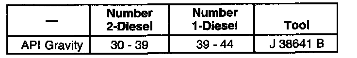 4. Refer to Fuel Oil Specific Gravity Requirements table. If the correct fuel is being used in the conditions listed in Fuel Quality, and meets number 1-Diesel or number 2-Diesel fuel oil specific gravity requirements, fuel is OK. If not, the fuel should be replaced.