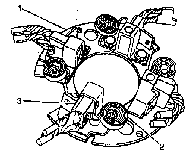 2. Install the brushes (3), to the brush holder assembly (1) with the springs (2).