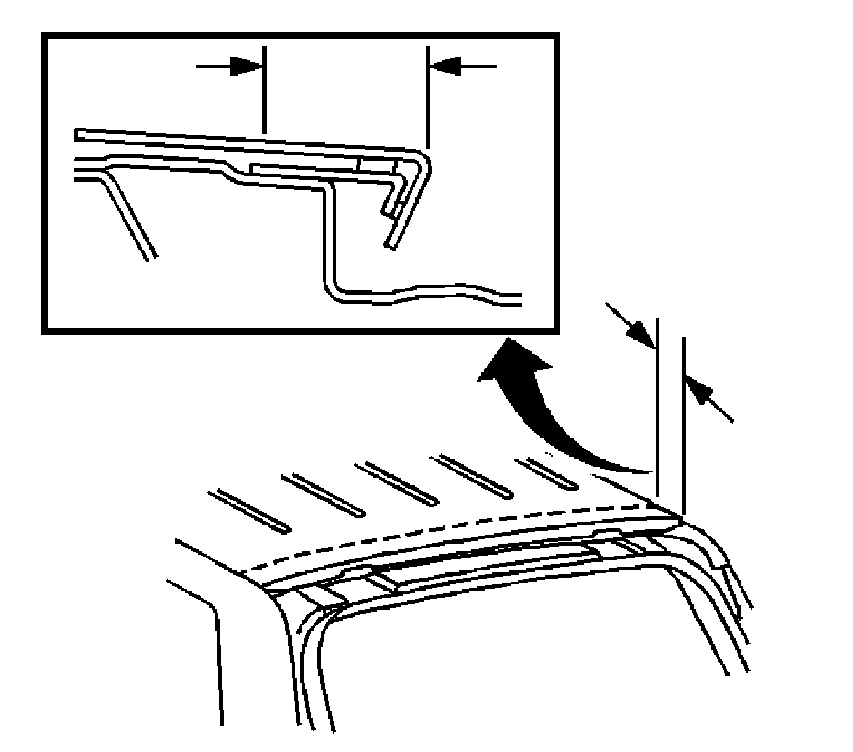 8. FOR 4 DOOR VEHICLES, measure 55 mm (2 3/16 in) forward of the downturn flange, and mark the cut line the width of the vehicle roof as shown using a tape measure or scale (See Illustration). FOR 2 DOOR VEHICLES, measure 65 mm (2 1/2 in) forward of the downturn flange, and mark the cut line the width of the vehicle roof as shown using a tape measure or scale (See Illustration).
