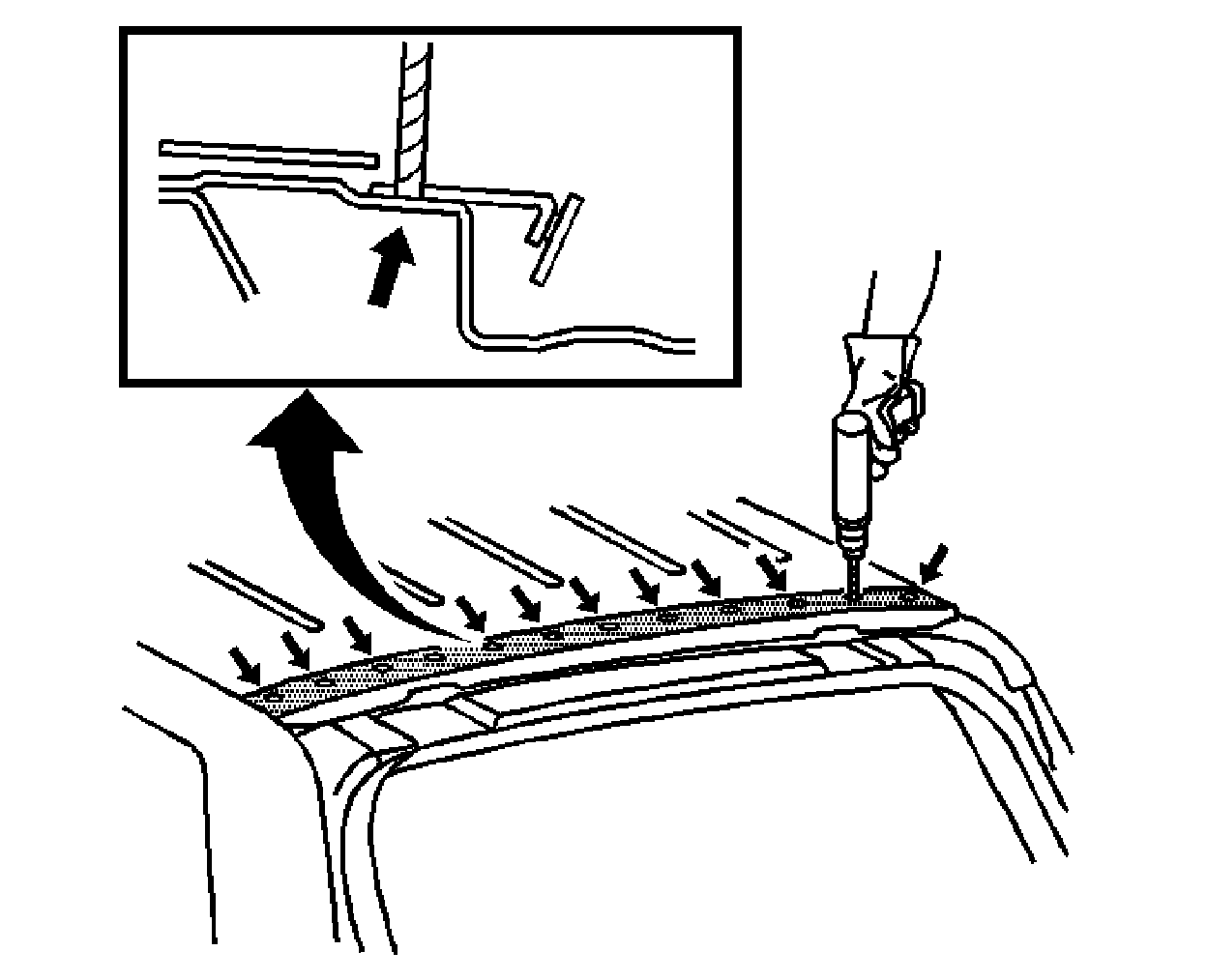 13. Locate and drill approximately 12 spot welds along the rear roof reinforcement.
