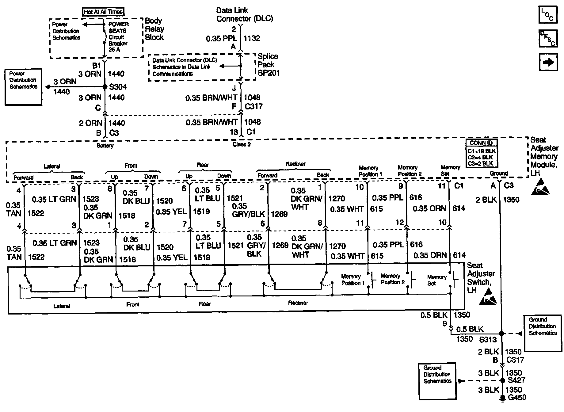 Memory Seats Schematics: Power,Ground,Data Link Connector (DLC) And Power Seat Adjuster Switch: