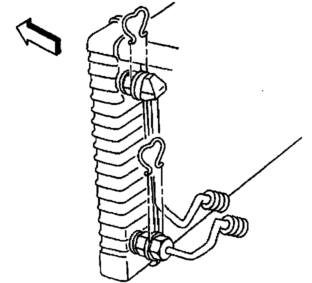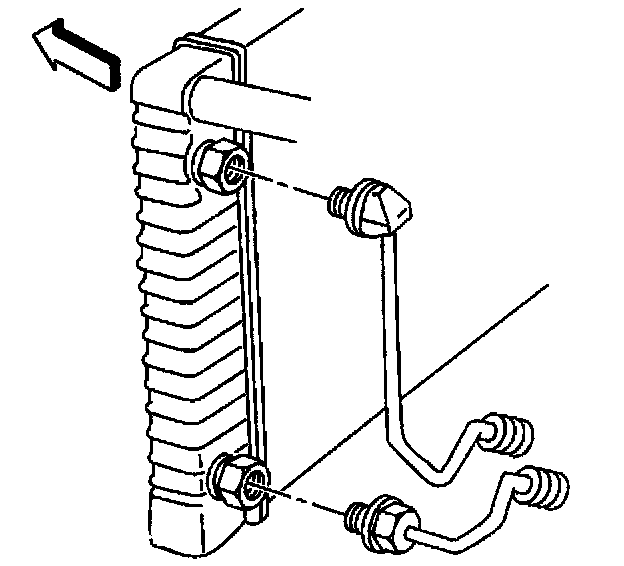 11. Remove the engine oil cooler lines from the quick connectors at the radiator engine oil cooler inlet and outlet.