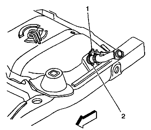 5. Wipe the fuel filler hose connection at the fuel tank and then disconnect the fuel filler hose and clamp (2).