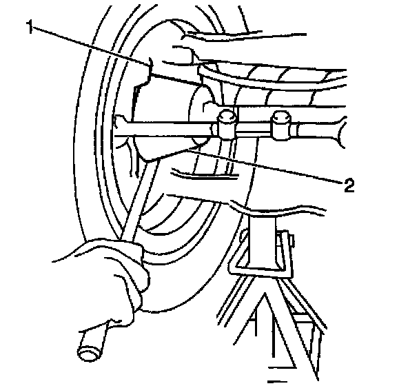 8. Pry between the lower control arm (2) and the outer bearing race (1) while reading the dial indicator. This shows vertical looseness in the ball joints. The lower ball joint is not preloaded and may show some looseness.