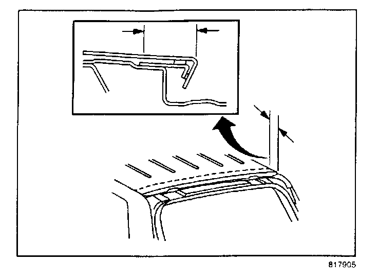 2. FOR 4 DOOR VEHICLES, measure 55 mm (2-3/16 in) forward of the downturn flange, and mark the cut line the width of the vehicle roof as shown using a tape measure or scale (See Illustration).