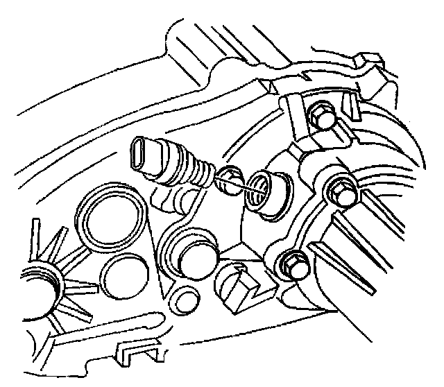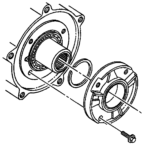 45. Apply a thin coat of RTV sealant GM P/N 12345739 or equivalent to the mating surface of the rear output shaft bearing cover Ensure no RTV is applied or push into the oil return port on the rear output bearing cover