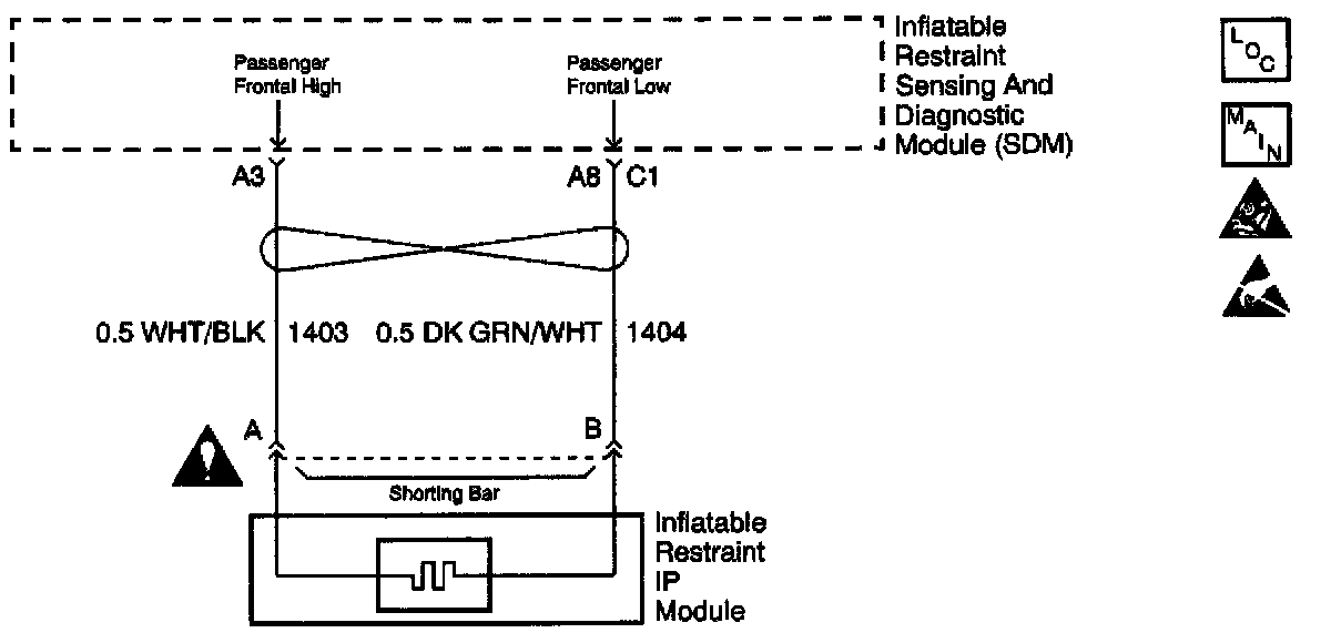 The passenger frontal air bag deployment loop is a 2 wire circuit. One wire is the high side of the loop while the other is the low side of the loop. When you first turn the ignition switch ON, the inflatable restraint Sensing and Diagnostic Module (SDM) performs tests to diagnose critical malfunctions within itself. Then the SDM performs the following continuous diagnostic tests on the deployment loops:
