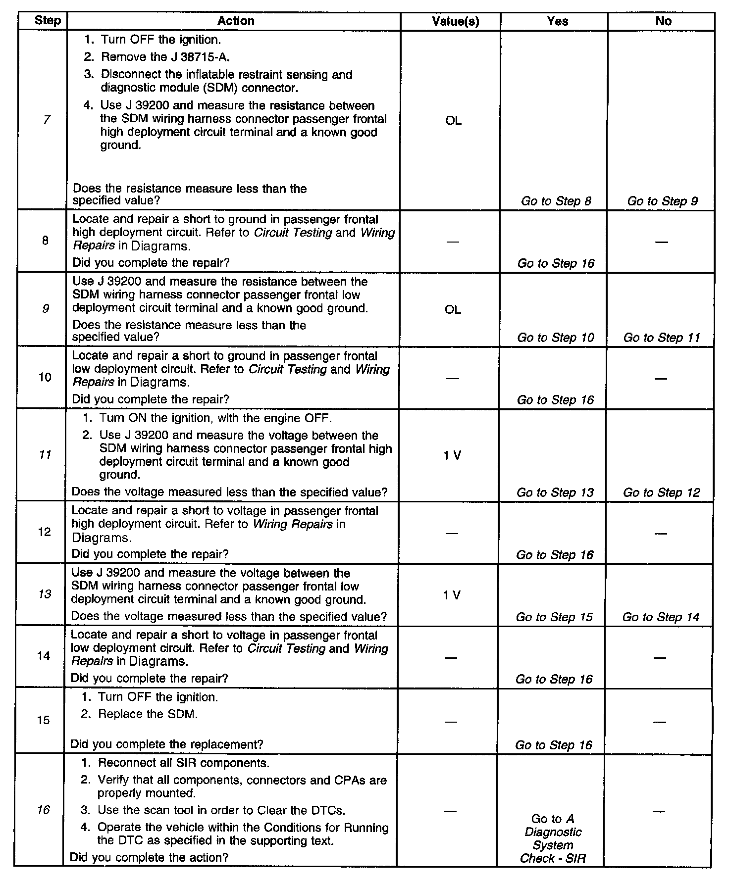 13. This step determines if there is a short to voltage in the passenger frontal low deployment circuit or if there is a malfunctioning SDM.