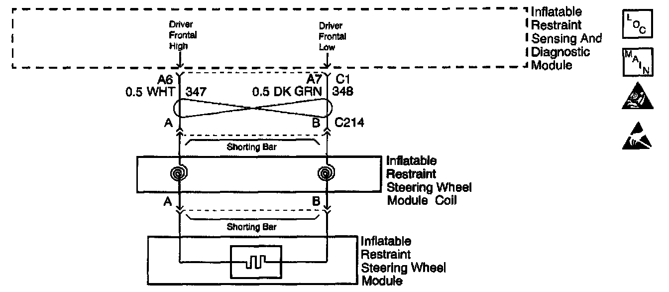 The driver frontal air bag deployment loop is a 2 wire circuit. One wire is the high side of the loop while the other is the low side of the loop. When you first turn the ignition switch ON, the inflatable restraint Sensing and Diagnostic Module (SDM) performs tests to diagnose critical malfunctions within itself. Then the SDM performs the following continuous diagnostic tests on the deployment loops: