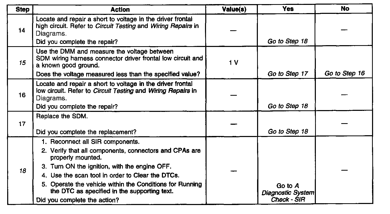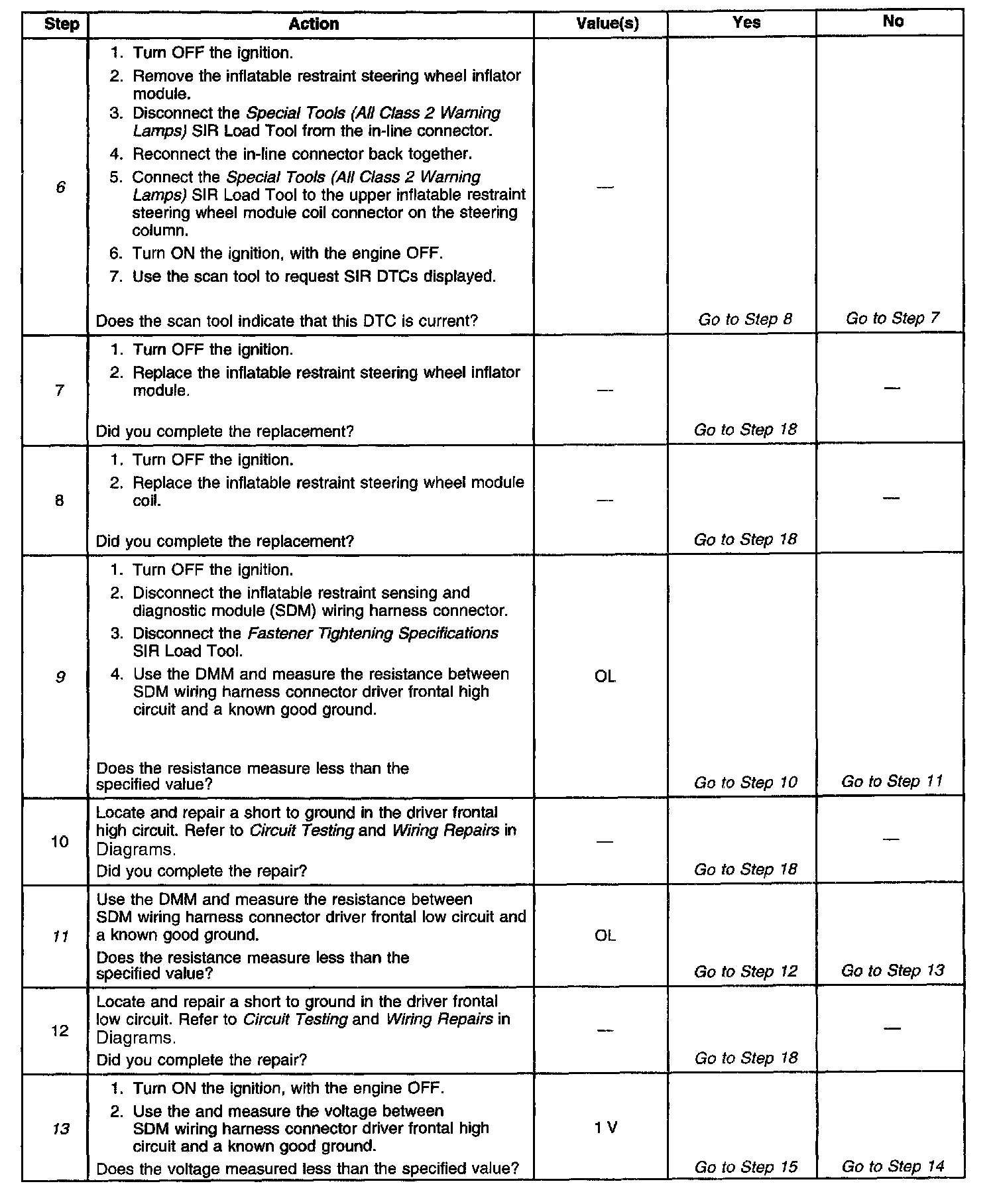 13. This step checks to see it there is a short to voltage in the driver frontal high deployment circuit.