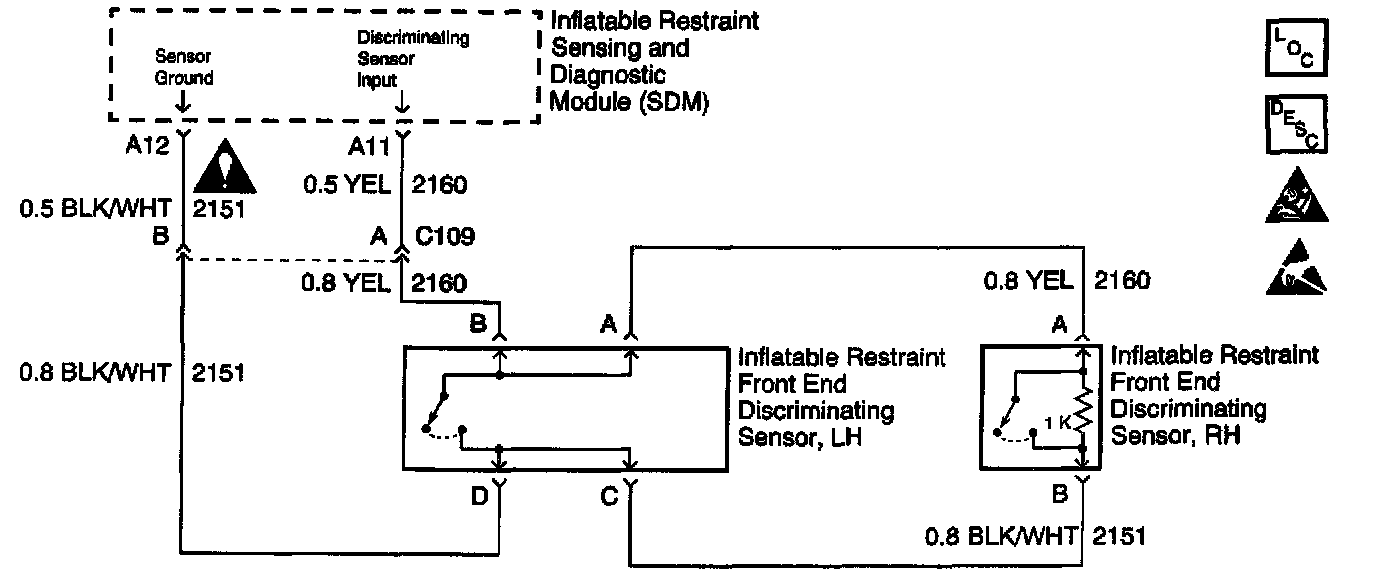 A broken or chafed wire in the inflatable restraint front end discriminating sensor circuits may cause an intermittent condition. Inspect CKT 2160 and CKT 2151 carefully for cutting or chafing.
