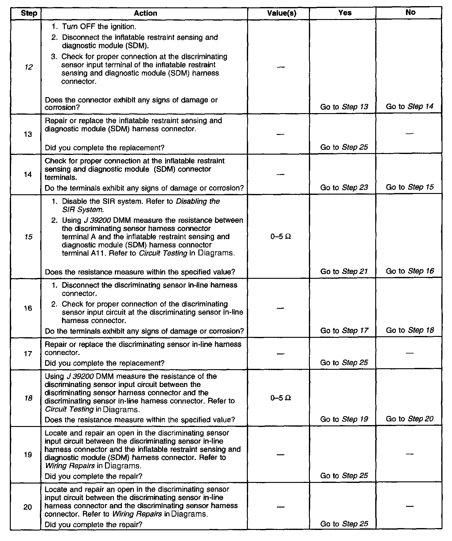 12. Tests for proper terminal contact of the inflatable restraint sensing and diagnostic module (SDM) connector.