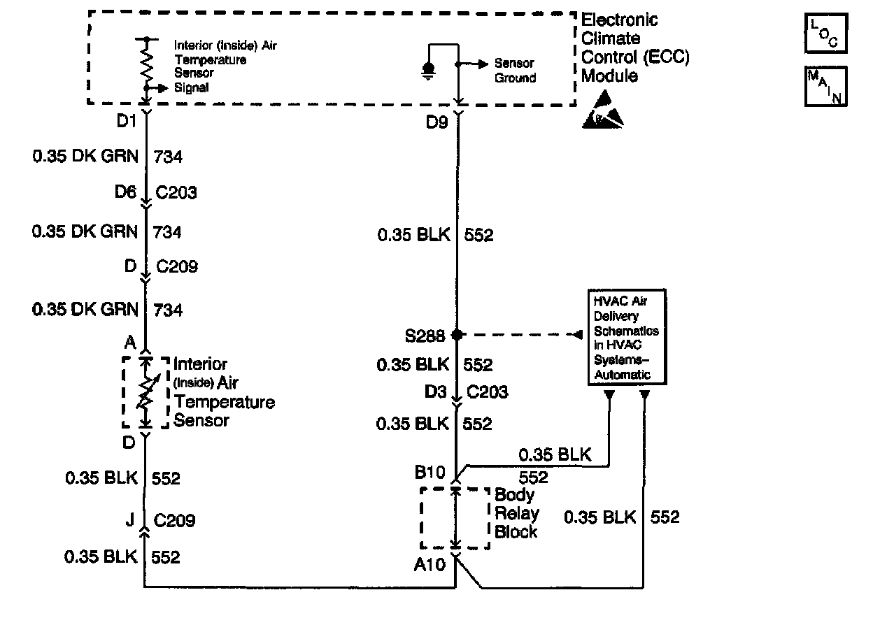 The HVAC control module monitors the inside air temperature via an inside air temperature sensor. When the air is cold, the sensor resistance and the signal voltage are high. When the air is warm, the sensor resistance and the signal voltage are low. The HVAC control module requests the A/C compressor clutch engagement and controls the air temperature door positions in order to maintain the temperature selected on the HVAC control module.
