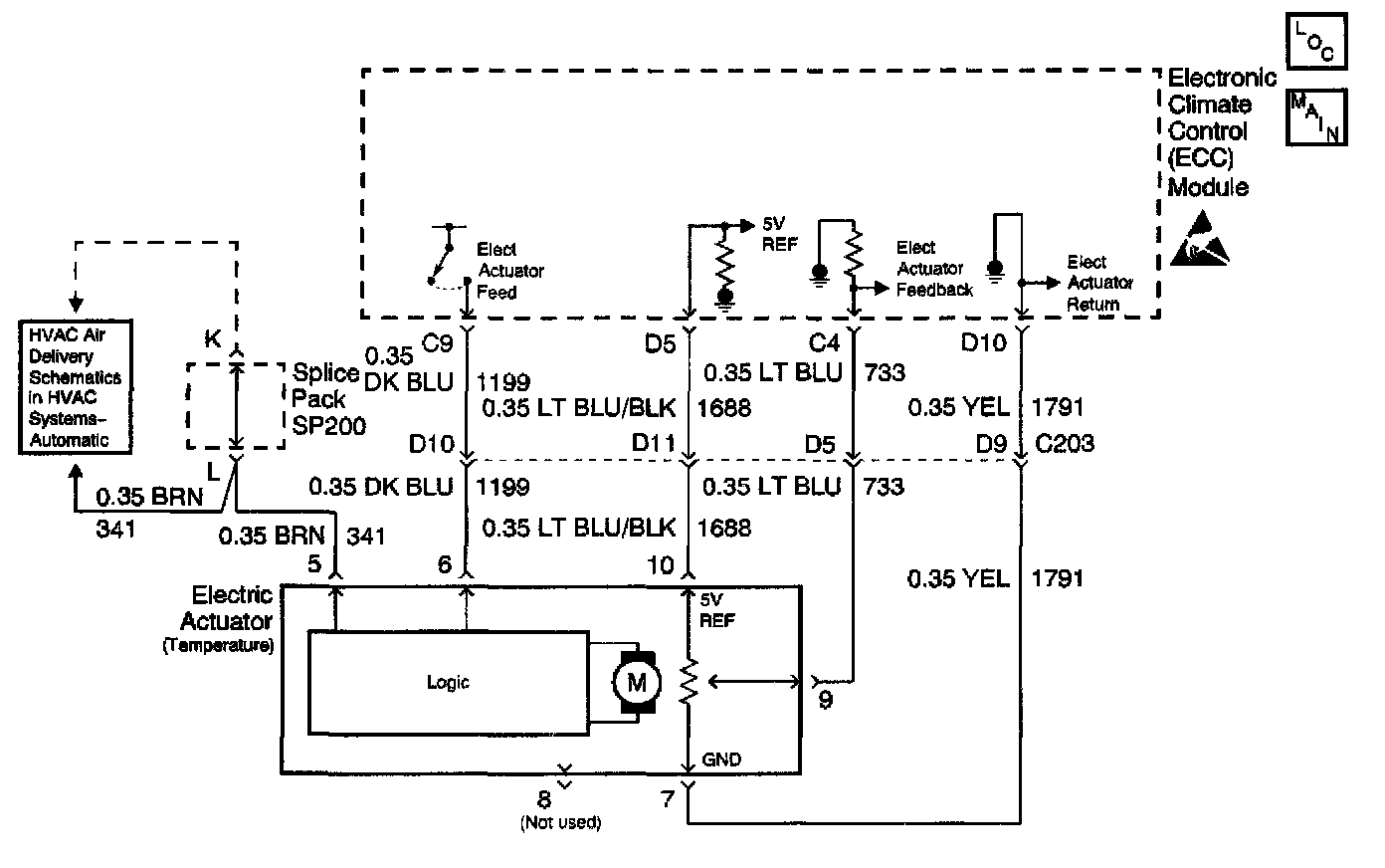 The HVAC control module receives a position signal from the air temperature actuator. The air temperature actuator position sensor is a potentiometer that is tied to a 5 V, reference source. The variable output from the potentiometer feeds back a position signal to a pull-up resistor which is located in the HVAC control module. This signal determines the necessary drive signal to the actuator motor which provides the proper air temperature door position. This value is stored in the Keep Alive Memory (KAM) portion of the HVAC control module.