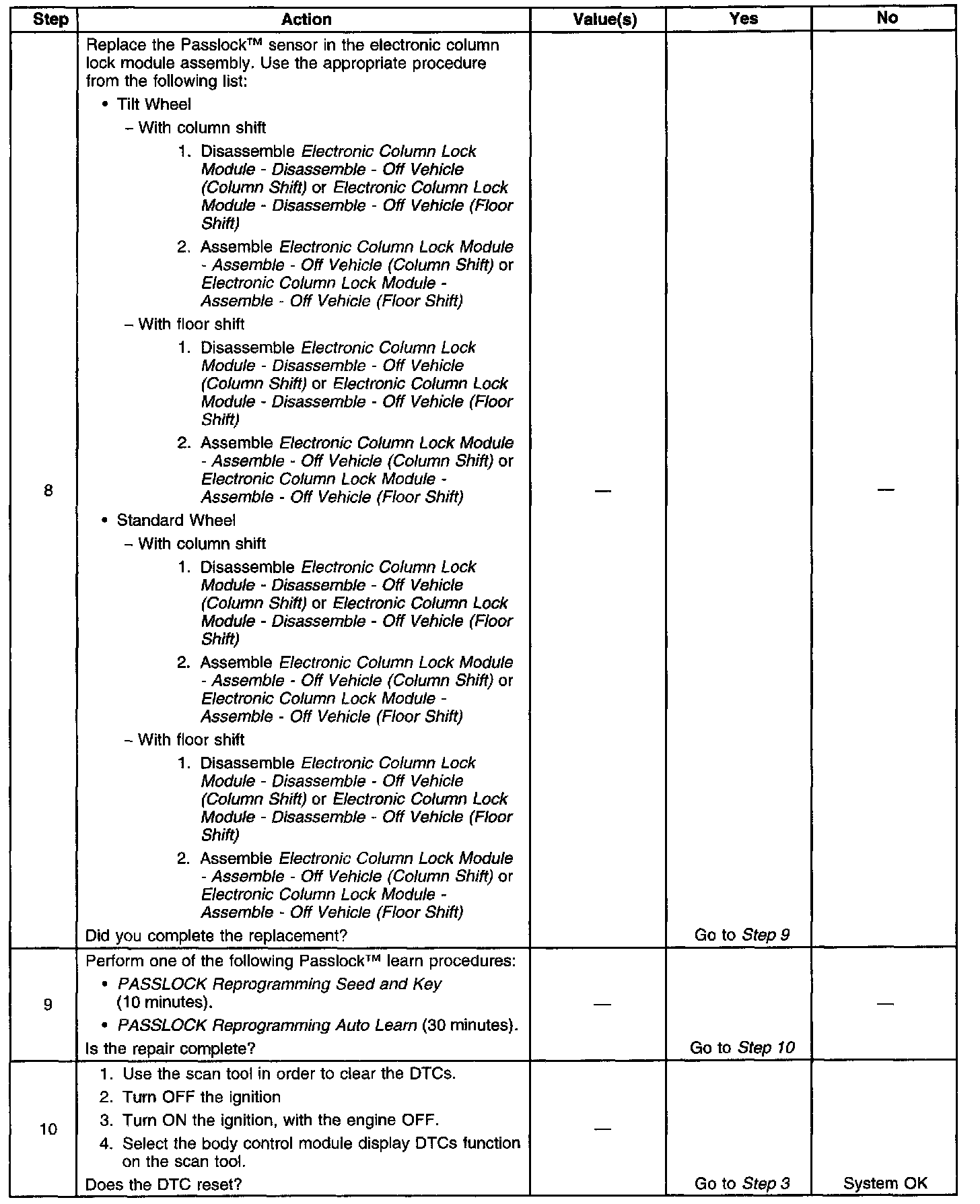 The PASSLOCK(TM) system is designed in order to prevent vehicle operation if the correct ignition key is not used in order to start the vehicle. The ignition key allows the lock cylinder to turn. Once the lock cylinder turns, the PASSLOCK(TM) sensor (located inside the ignition switch assembly) sends an analog voltage code to the Body Control Module (BCM). If the BCM receives the correct analog voltage code from the PASSLOCK(TM) sensor, the BCM sends a class 2 serial data password to the Powertrain Control Module (PCM)/Vehicle Control Module (VCM). This action allows the vehicle to start.