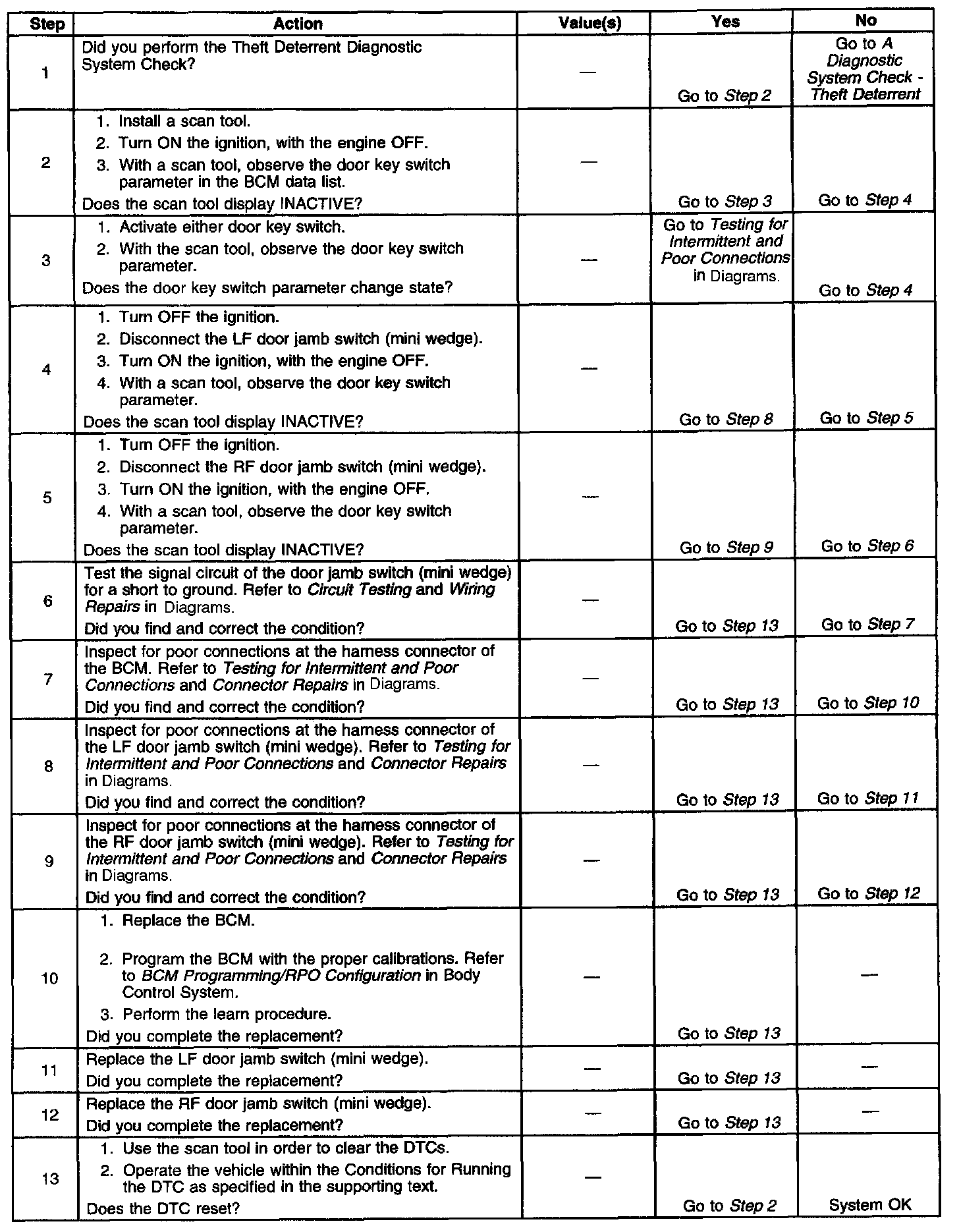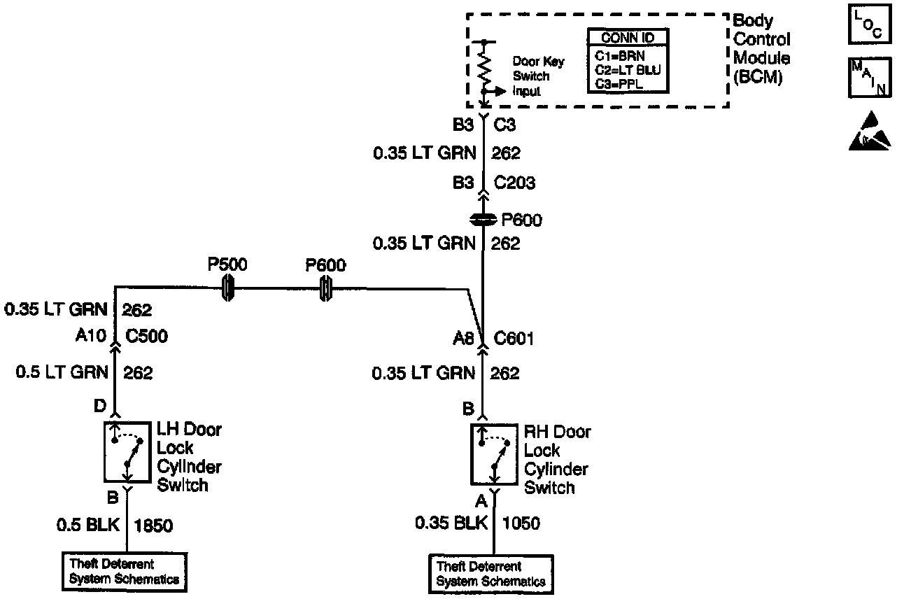 The Body Control Module (BCM) monitors the door key switch circuit for the content theft system. The BCM supplies battery voltage switch circuit. When a key is turned in either the LH or RH door lock cylinder, the door key switch is activated which pulls the door key switch circuit low. When detected by the BCM, it will disarm the content theft system or cancel a CTD alarm.