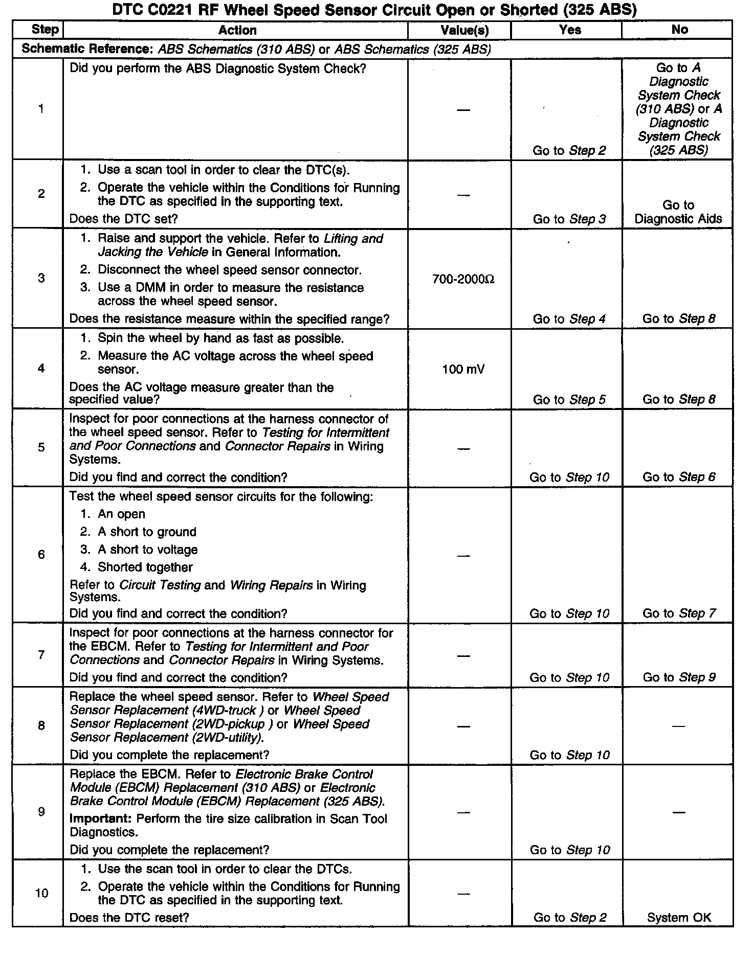When inspecting a wheel speed sensor, inspect the sensor terminals and the harness connector for corrosion. If evidence of corrosion exists, replace the wheel speed sensor. Refer to Wheel Speed Sensor Replacement (4WD-truck ) or Wheel Speed Sensor Replacement (2WD-pickup ) or Wheel Speed Sensor Replacement (2WD-utility).