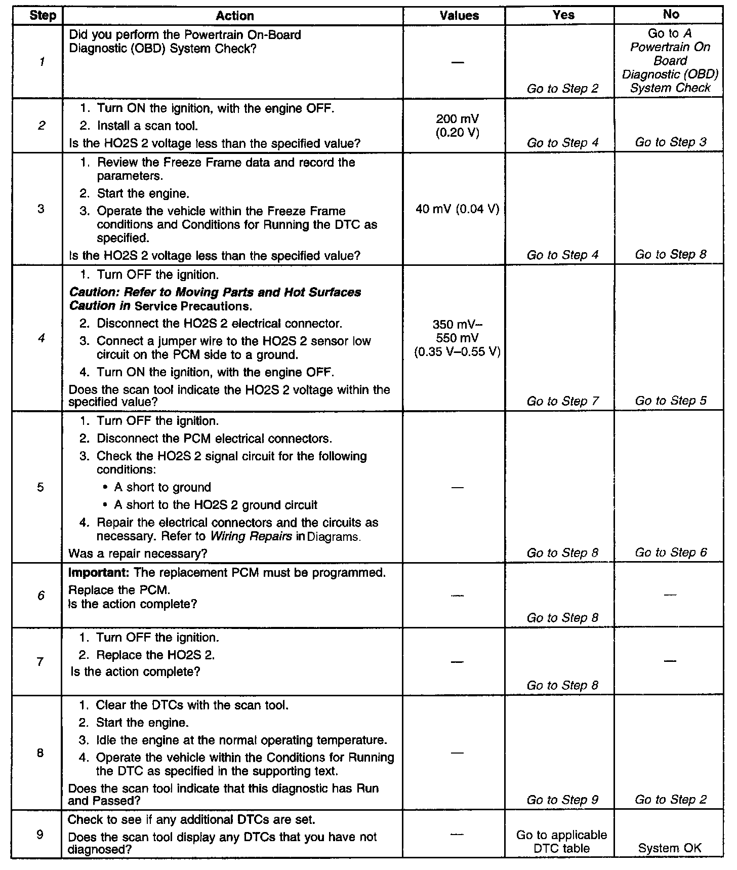 4. It is necessary to jump the HO2S 2 low circuit to ground in order to allow the PCM to display the supplied bias voltage. The PCM and the wiring are OK if the voltage is between 0.35 volts and 0.55 volts.