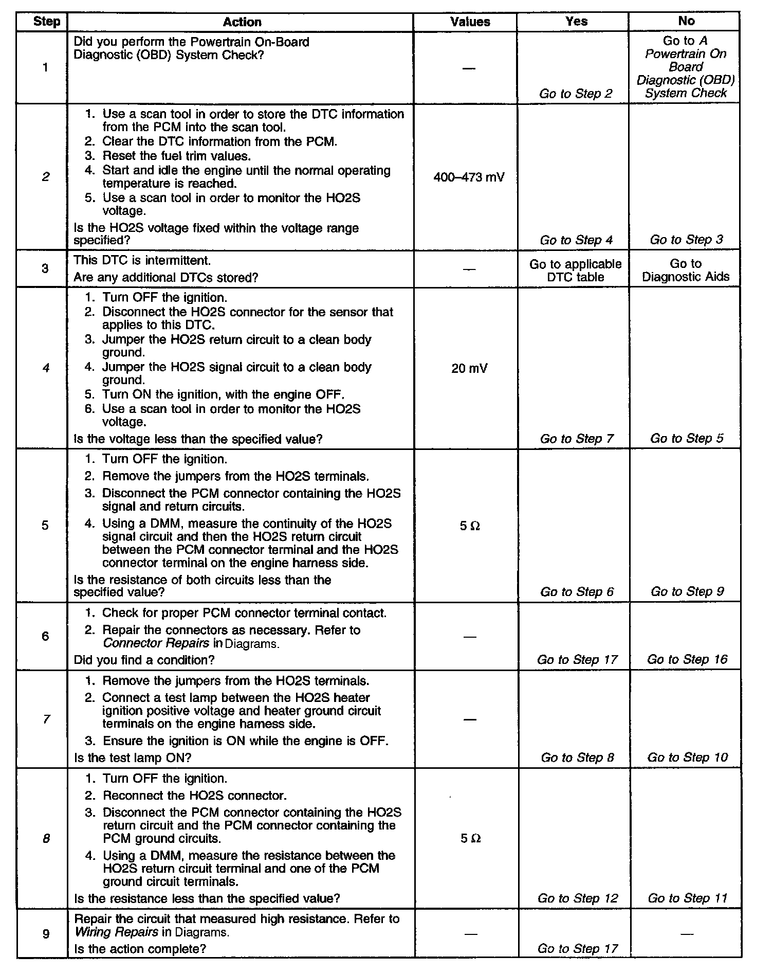 With the ignition ON and the engine OFF, the HO2S voltage displayed on a scan tool should gradually drop to below 0.150 volts, indicating that the heater works properly. If not, disconnect the HO2S and connect a test lamp between the terminals C and D. If the test lamp does not light, repair the open in the HO2S ground circuit or the HO2S ignition positive voltage circuit. If the test lamp lights, replace the HO2S.