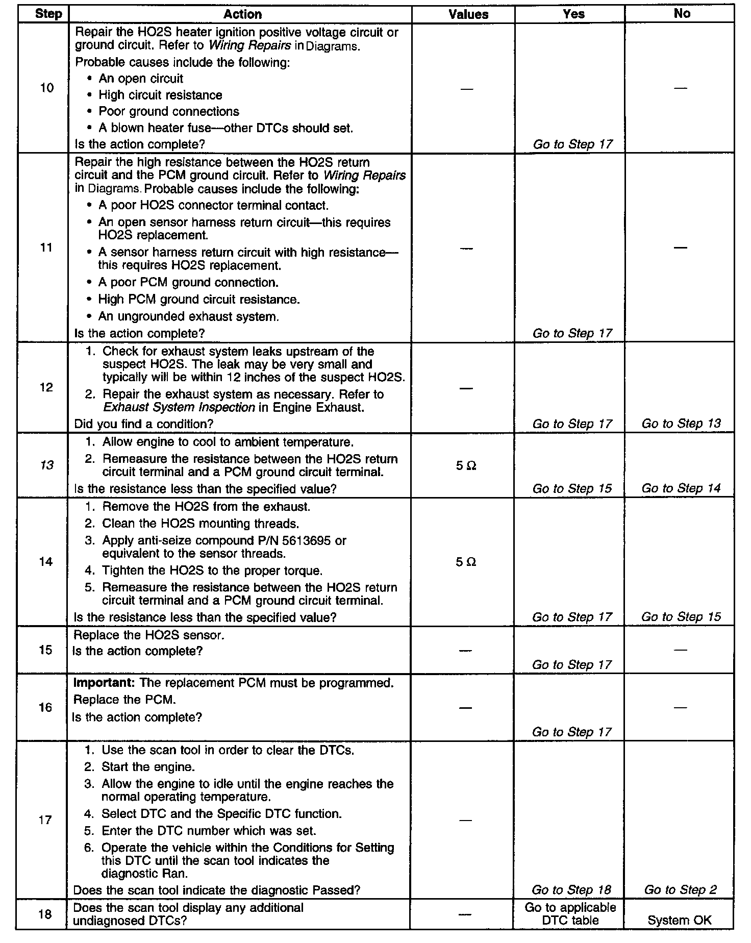 13. This step checks for proper circuit resistance between the HO2S LOW circuit and PCM ground with a COLD sensor. A loose HO2S or poor thread to the exhaust electrical contact will cause higher resistance when the HO2S is cold. Although 500 ohms is allowed, typical resistance should be less than 50 ohms.