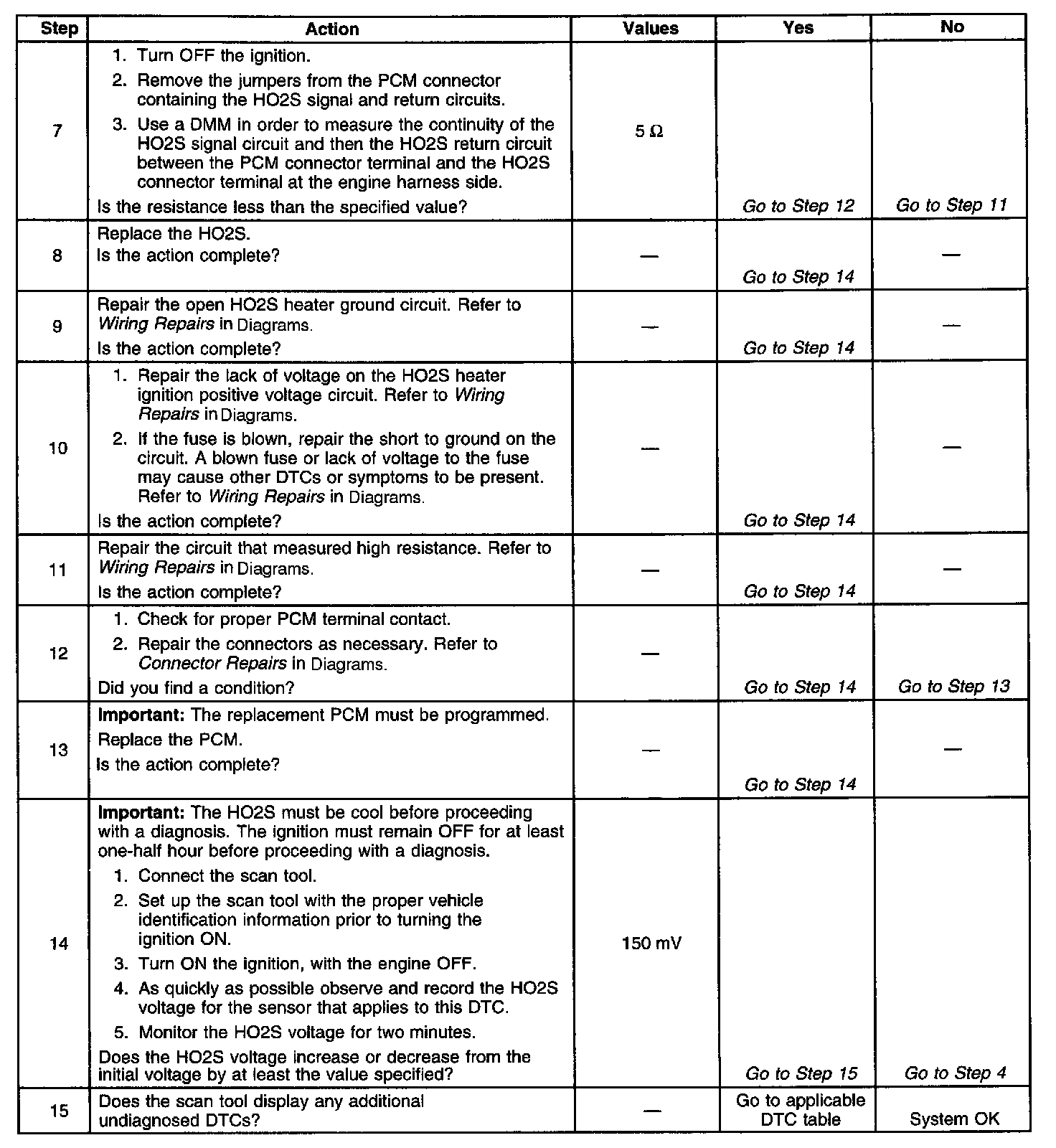 The numbers below refer to the step numbers on the diagnostic table.