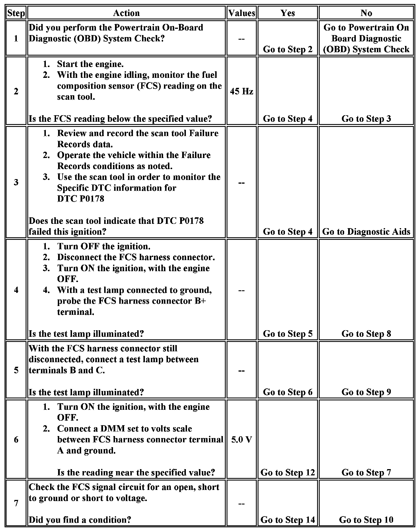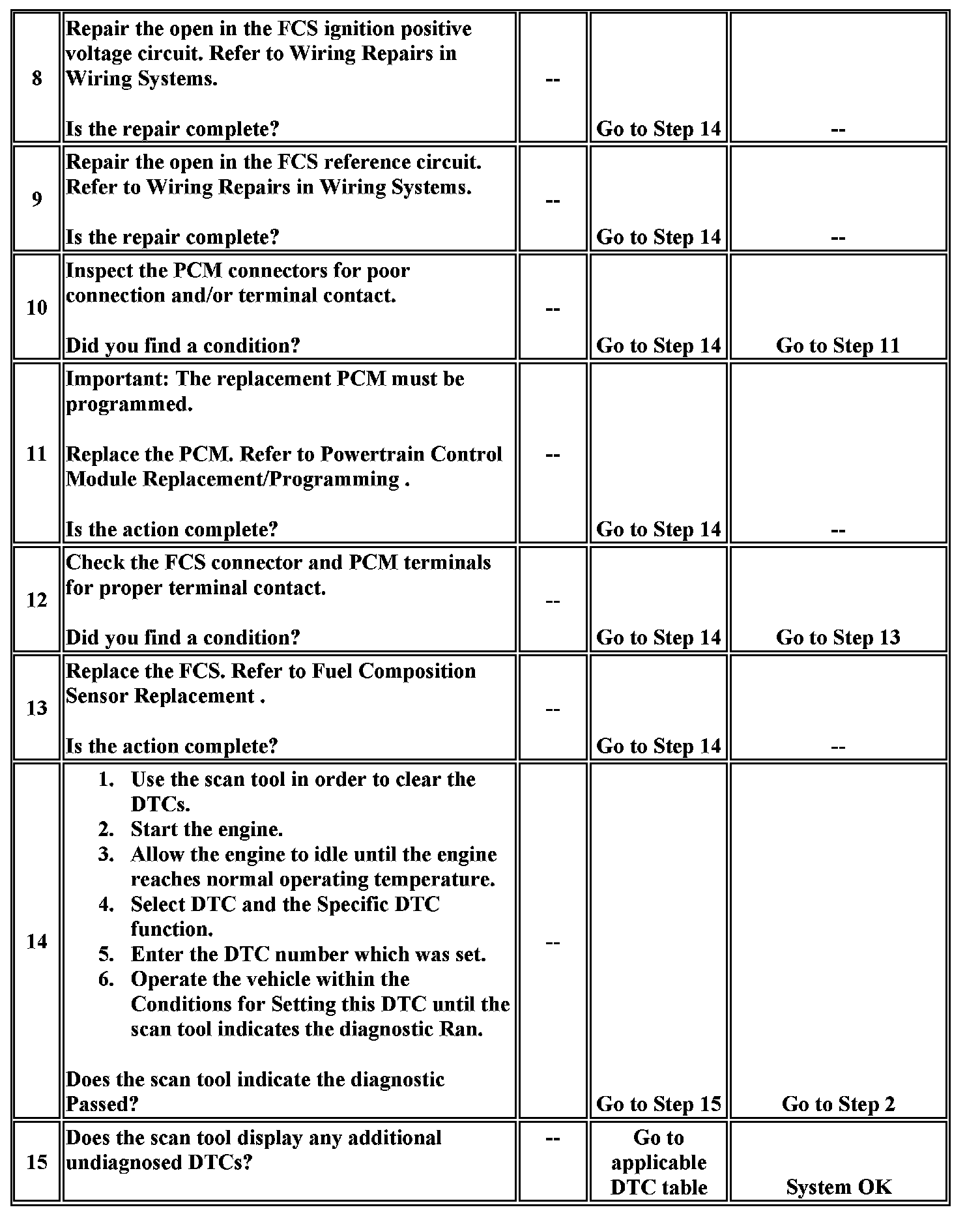 The J-44175 fuel composition tester can be used to check the accuracy of the sensor if a fault is not isolated using this table. If the Fuel Test is performed before the electrical circuits have been tested using this table, the results will be in error.