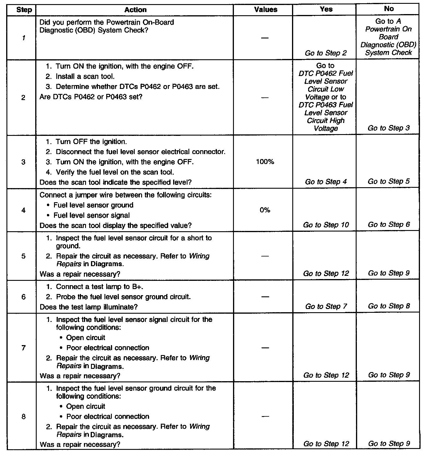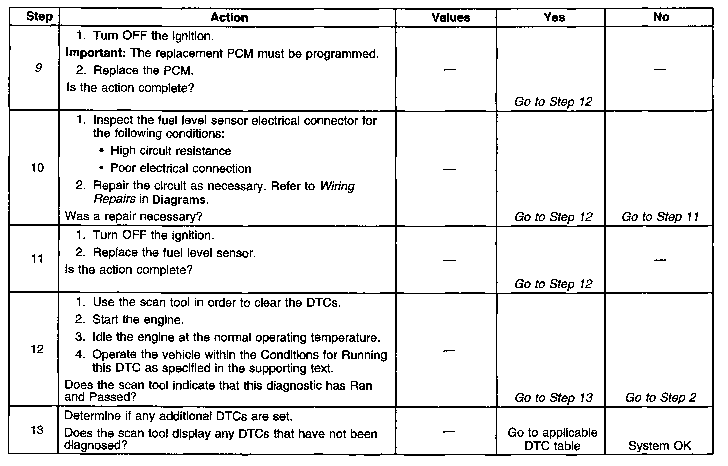 The numbers below refer to the step numbers on the diagnostic table.
