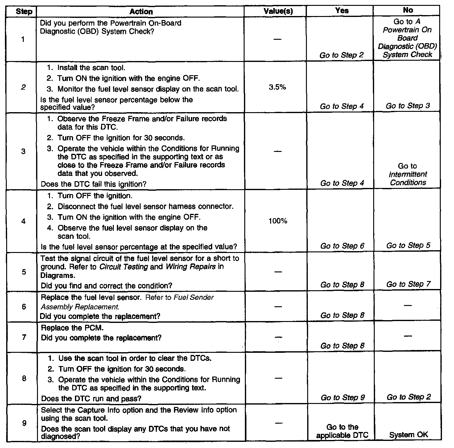 The Fuel Level Sensor changes resistance based on fuel level. The Fuel Level Sensor has a signal circuit and a ground circuit. The PCM applies a voltage (about 5.0 volts) on the signal circuit to the sensor. The PCM monitors changes in this voltage caused by changes in the resistance of the sensor to determine fuel level.