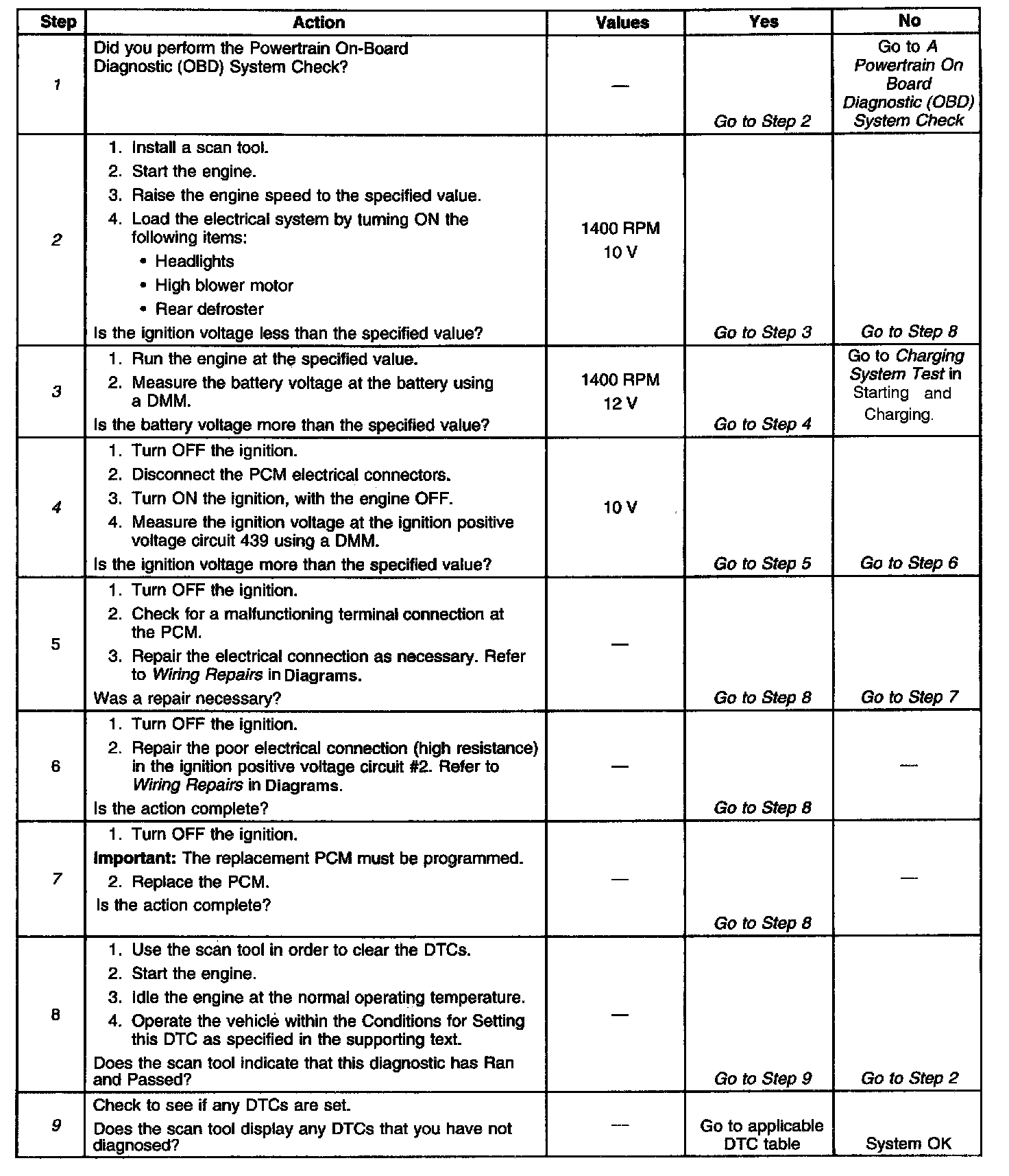 The numbers below refer to the step numbers on the diagnostic table.