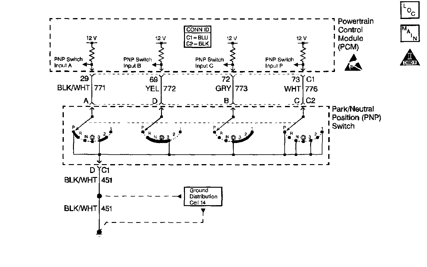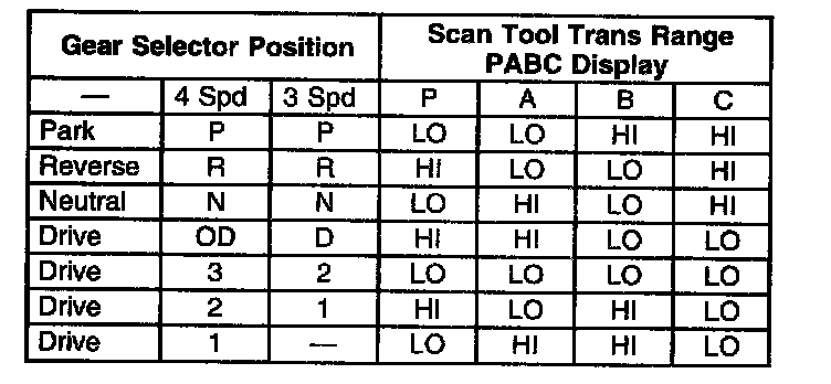 The transmission range switch, which is part of the Park/Neutral Position (PNP), is a multi-signal switch which sends a signal to the PCM to indicate gear selection. The transmission range switch uses 4 discrete circuits to pull 4 PCM voltages low in various combinations to indicate each gear range. The voltage level of the circuits is represented as LO = grounded, HI = open circuit. The 4 states displayed represents the encoder P, A, B, and C inputs in sequence.