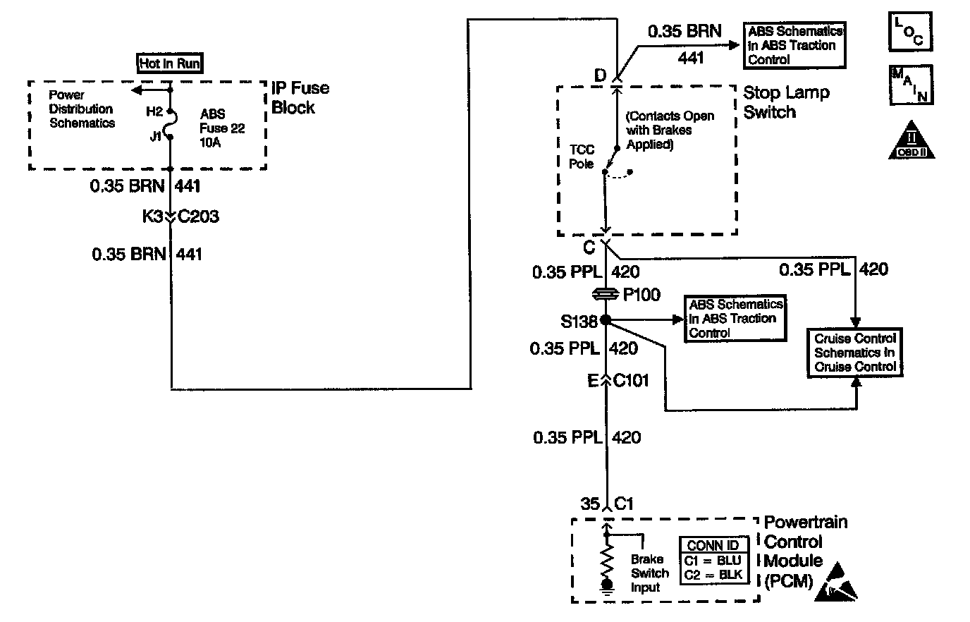 The brake switch indicates brake pedal status to the Powertrain Control Module (PCM). The brake switch is a normally-closed switch that supplies battery voltage on circuit 420 to the PCM. Applying the brake pedal opens the switch, interrupting voltage to the PCM. When the brake pedal is released, the PCM receives a constant voltage signal. If the PCM receives a zero voltage signal at the brake switch input, and the Torque Converter Clutch (TCC) is engaged, the PCM de-energizes the TCC solenoid valve. The PCM disregards the brake switch input for TCC scheduling if there is a brake switch circuit fault (Refer to Diagnostic Aids).