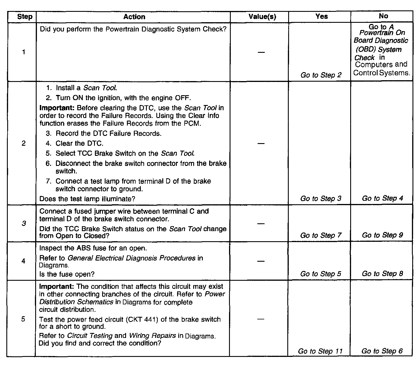 ^ If the PCM detects a brake switch circuit fault, then the brake switch input is disregarded for TCC scheduling. The PCM then uses throttle position and vehicle speed to determine TCC application and release. Use of these inputs may result in a noticeable harsh apply or abrupt release of the TCC.