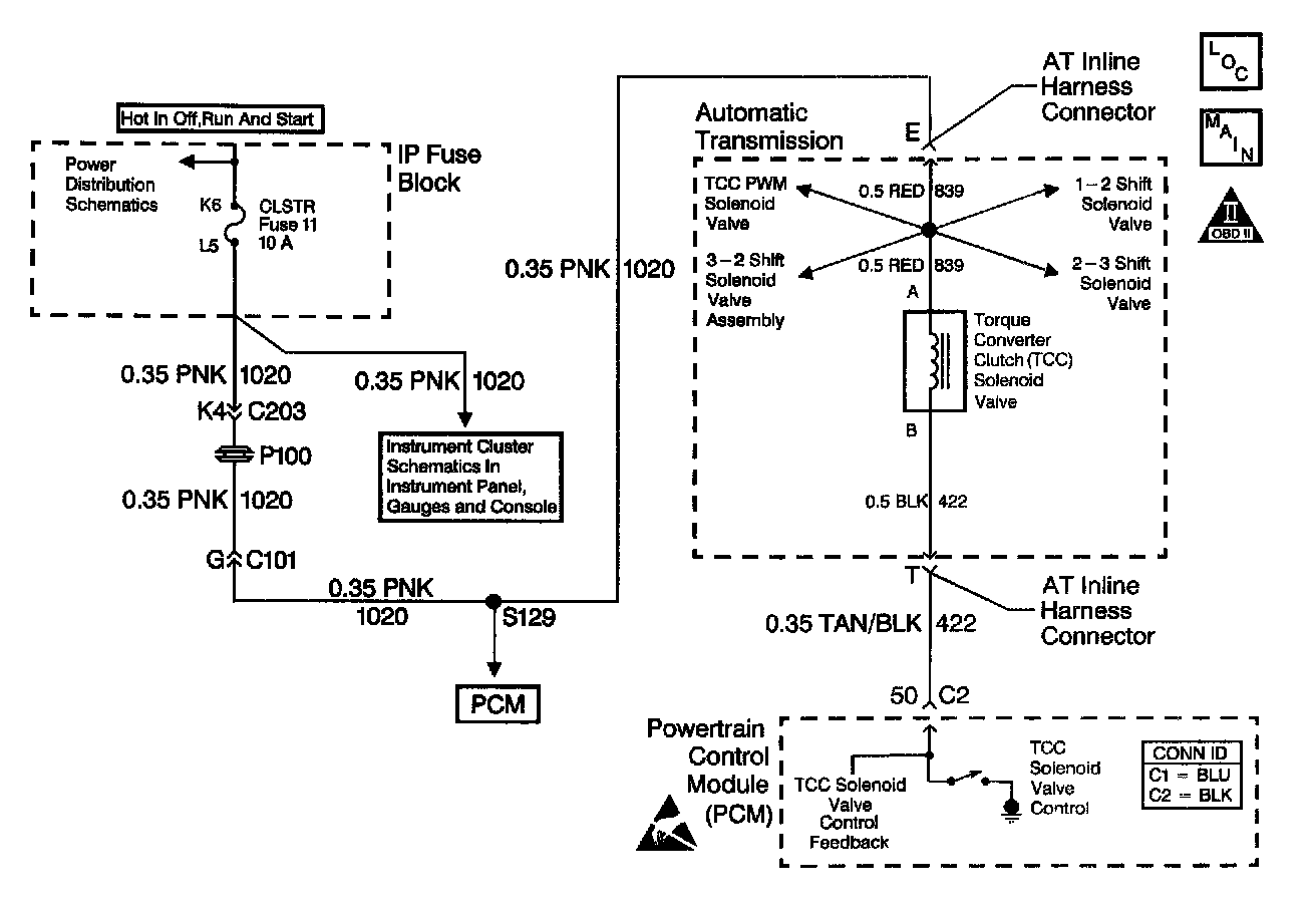 The Torque Converter Clutch (TCC) solenoid valve is an electrical device that is used with the Torque Converter Clutch Pulse Width Modulation (TCC PWM) solenoid valve in order to control TCC apply and release. The TCC solenoid valve attaches to the transmission case assembly extending into the pump cover. The TCC solenoid valve receives ignition voltage through circuit 1020. The Powertrain Control Module (PCM) controls the solenoid by providing the ground path on circuit 422. The PCM monitors the Throttle Position (TP) voltage, the vehicle speed, and other inputs in order to determine when to energize the TCC solenoid valve.